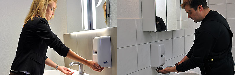 Das milde, pH-Wert neutrale Seifenkonzentrat wird durch unser spezielles Spendersystem aufgeschäumt und portionsgerecht an den Benutzer/in abgegeben.