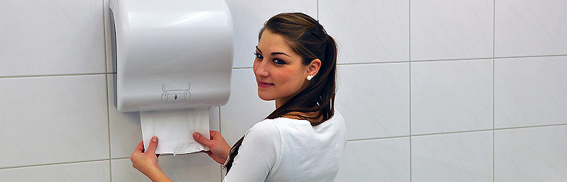 Kompakter, sehr schneller Sensor-Handtuchspender der auch in kleine Waschräume passt.